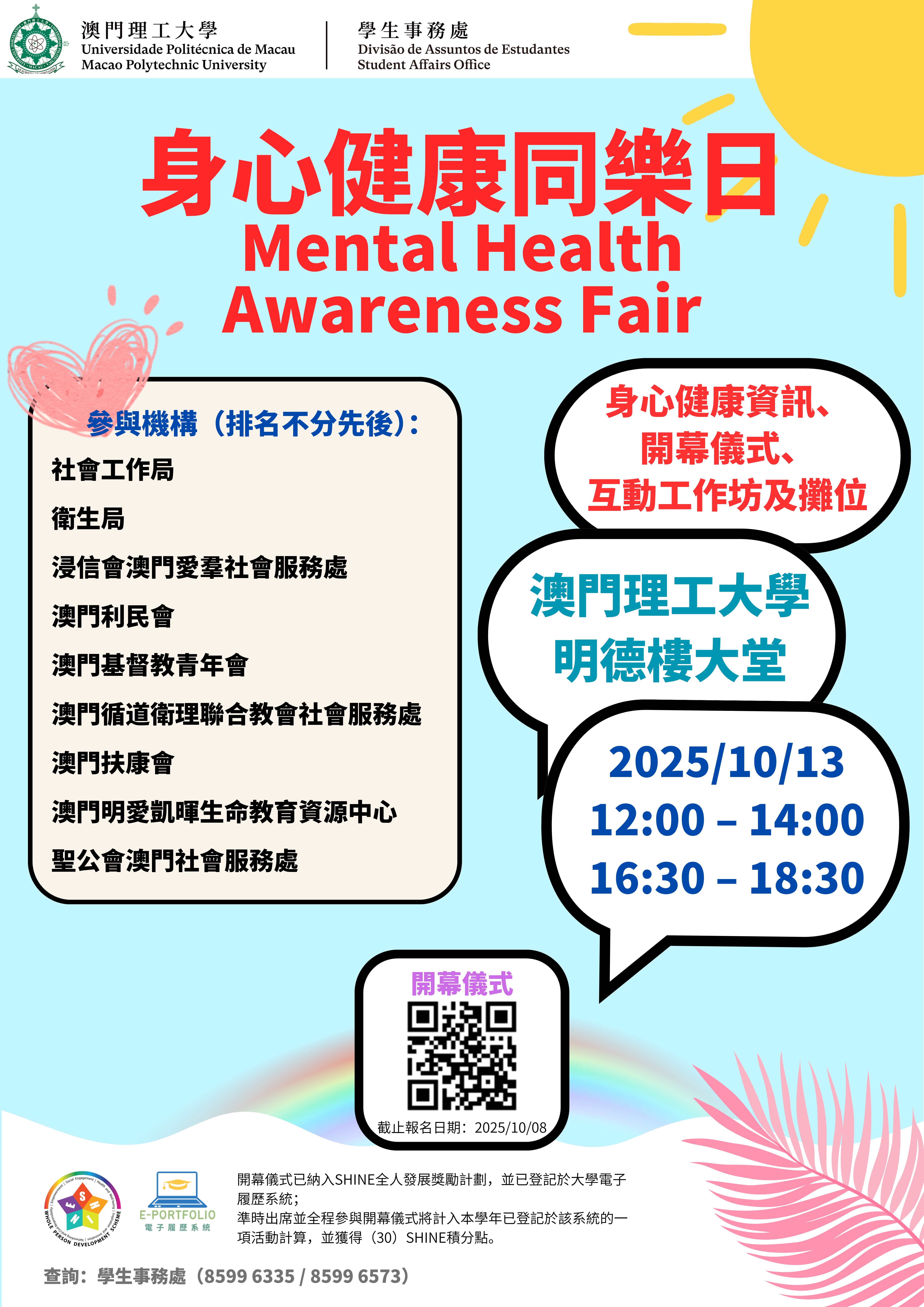 In response to World Mental Health Day on October 10, to promote mental health education, and enhance students’ awareness of physical and mental well-being, the Student Affairs Office will organise a “Mental Health Awareness Fair”, inviting government departments and several social service organisations in Macao to set up mental health interactive booths on campus, establishing a “Healthy Campus”. Details are as follows: