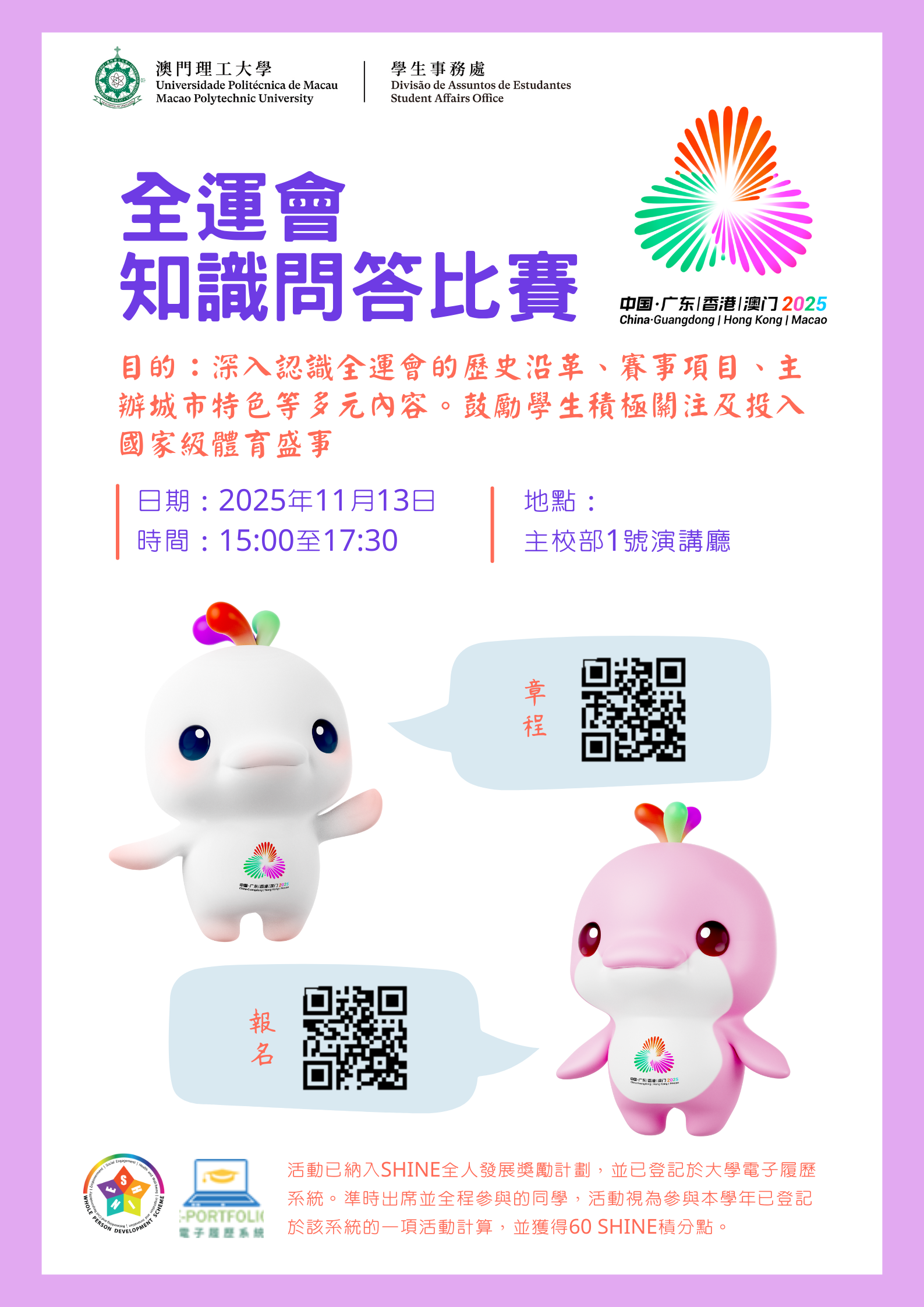 為深入認識全運會的歷史沿革、賽事項目、主辦城市特色等多元內容,鼓勵學生積極關注及投入國家級體育盛事,學生事務處將於2025年11月13日舉行全運會知識問答比賽,活動詳情如下: