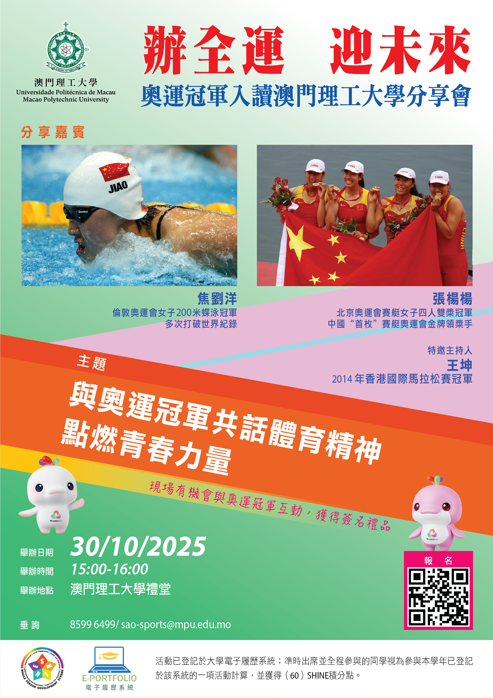 為迎接即將來臨的第十五屆全國運動會,健康科學及體育學院與學生事務處將於2025年10月30日舉行“辦全運 迎未來”奧運冠軍入讀澳門理工大學分享會,活動詳情如下: