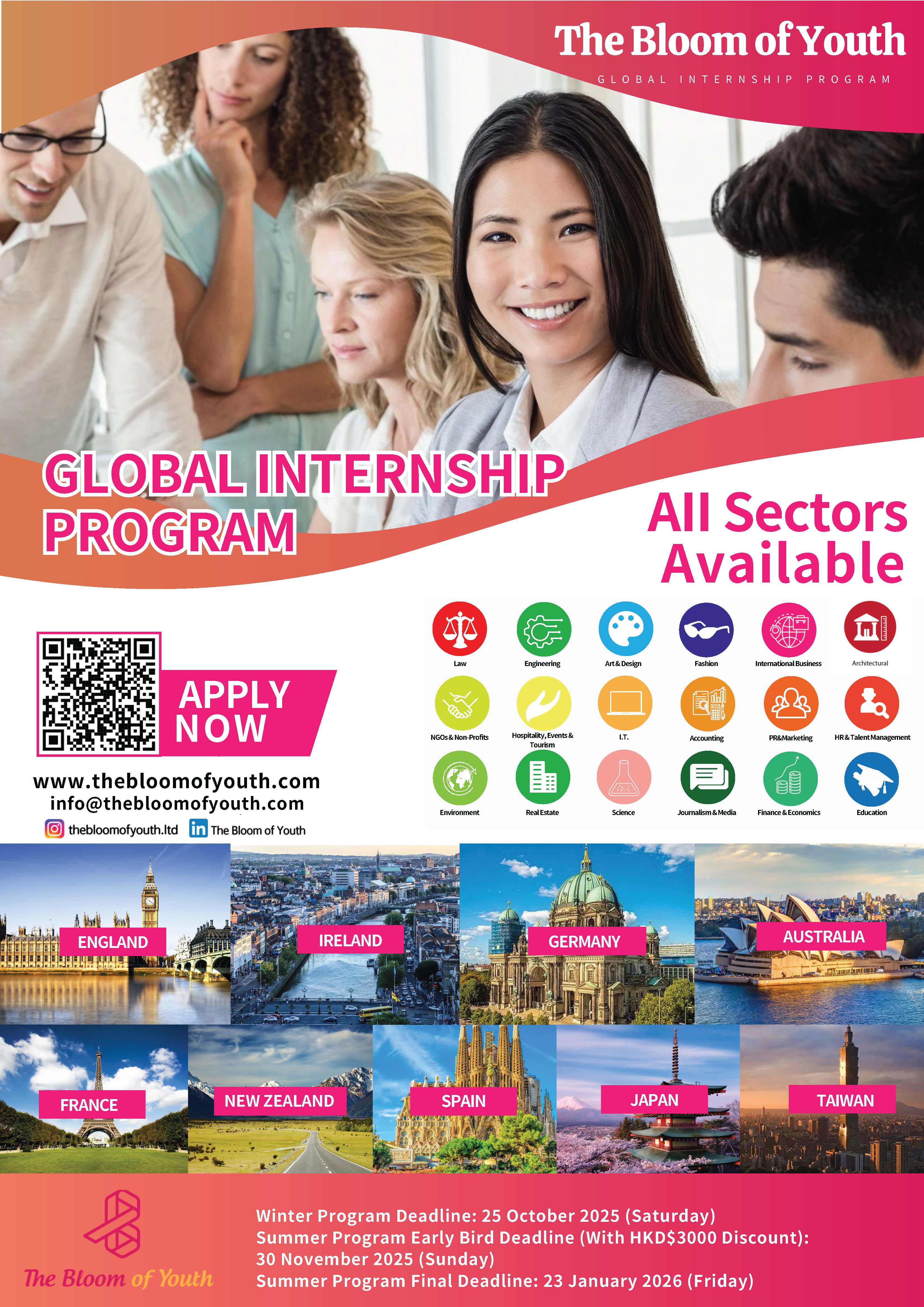 The Bloom of Youth 提供實習機會,目的地包括:英國、西班牙、德國、法國、愛爾蘭、澳大利亞、新西蘭、日本等。為推廣有關計劃,將於2025年11月11日舉辦線上資訊講座。詳情如下: